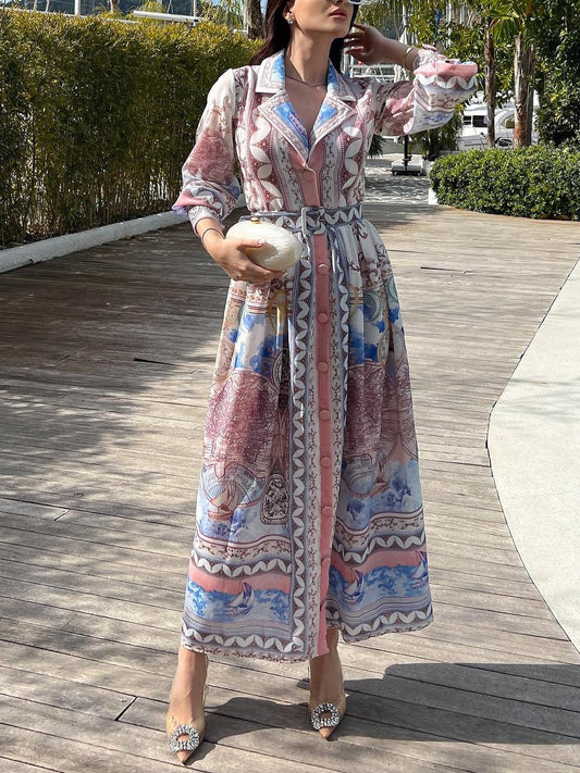 Midi&Long Sleeve Printed Belted Dress