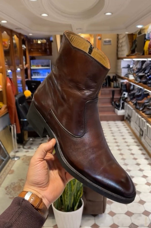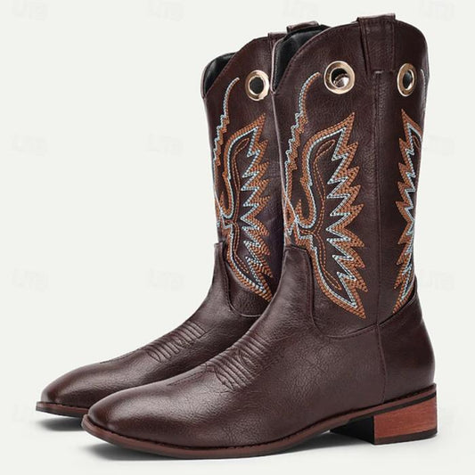 Men's Brown Western Cowboy Boots With Embroidered Detailing & Metal Eyelets